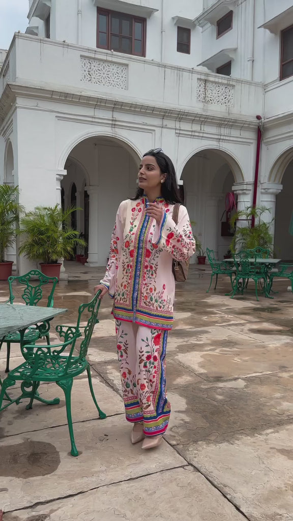 Wrap Yourself In Timeless Charm With Our Hermosa Cord Set – Where Soft Elegance Meets Modern Touch.Crafted In A Dreamy Cream Hue And Adorned With Delicate Orange Flower Prints, And It's Vine Going Along The Borders This Co-Ord Also Features Colourful Borders Along The Neckline Which Makes It Your Perfect Go-To For Effortless Grace.