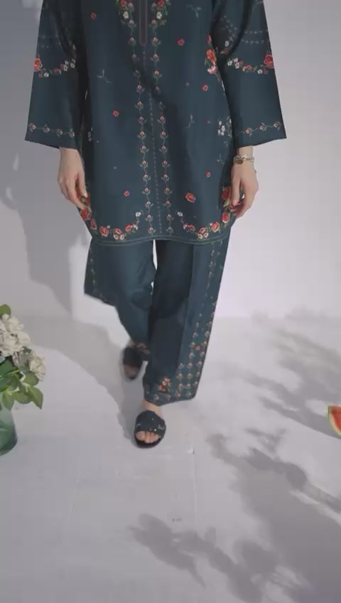 Elegant Dark Teal Cord Set Featuring Intricate Floral Prints, Straight Pants, And A Relaxed Fit Kurta With Flowy Sleeves – Perfect For A Chic Yet Comfortable Look Also Making It Perfect For Both Casual Outings And Party Wear