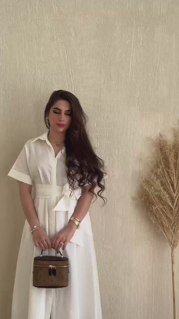 Elevate your wardrobe with the timeless charm of the Isvara Dress, a crisp white shirt dress designed for effortless sophistication. Featuring a classic collared neckline, short rolled sleeves, and a sleek button-down front, this dress is cinched at the waist with a detachable fabric tie for a flattering silhouette. Crafted from premium Swiss linen, it offers unmatched breathability and lightweight comfort—perfect for warm, sunny days or chic evening gatherings.