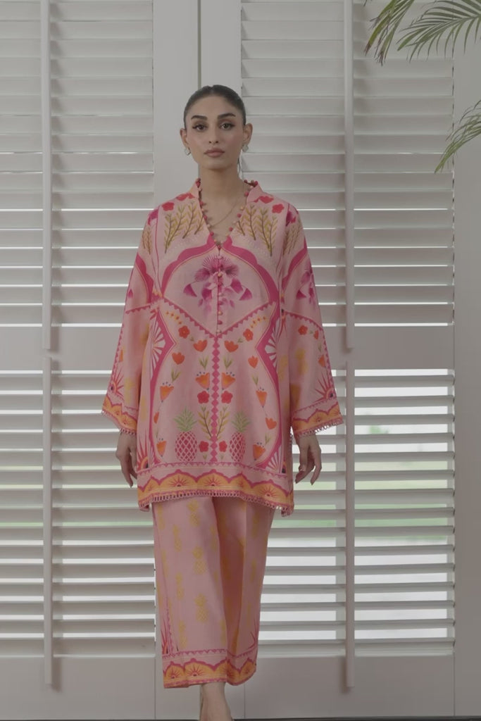 Bright And Stylish Pink Kurta Set, Adorned With Tropical Inspired Motifs And Bold Hues Of Orange, Yellow, And Fuchsia. Designed With A Relaxed Silhouette, Statement Sleeves, And Comfortable Wide-Leg Pants, It Combines Modern Chic With Effortless Ease. Making It A Perfect Choice For Casual Gatherings, Daytime Events