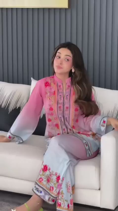 Graceful Pink And White Ombre Cord Set Adorned With Intricate Floral Prints And Detailed Borders, Featuring A Straight Kurta Paired With Matching Trousers, Perfect For A Chic Yet Comfortable Ethnic Look.