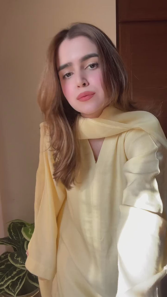 Crafted in breathable cotton viscose, the kurta features a relaxed, flowing cut with a delicately structured neckline and softly flared sleeves that enhance its graceful movement. The butter-toned farshi bottom drapes beautifully, creating a fluid and regal silhouette with every step. Paired with a sheer organza dupatta that adds a touch of lightness and sophistication, this set is perfect for intimate gatherings, daytime festivities, and serene celebrations.