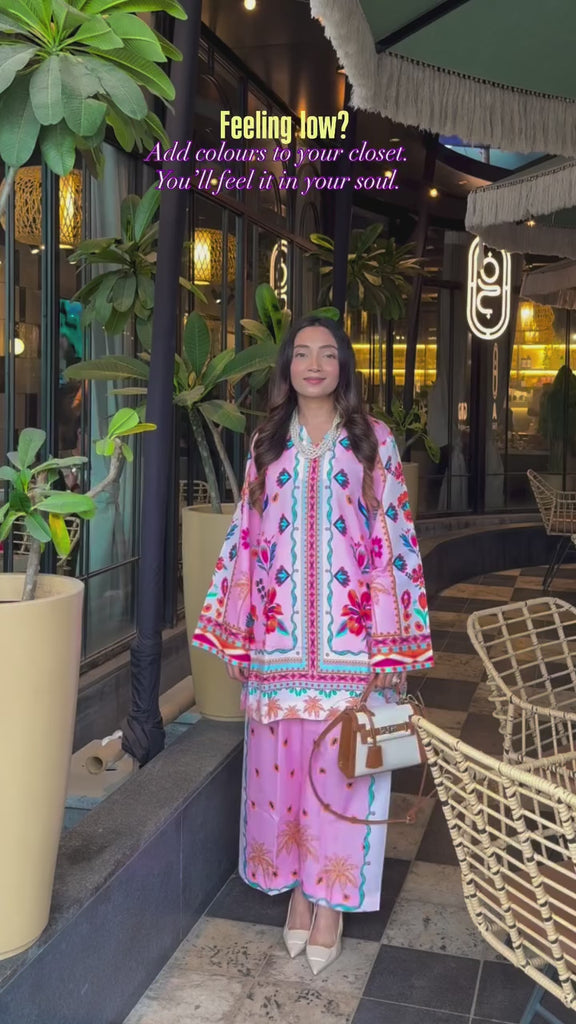 Elevate your everyday style with this vibrant HIBISCUS SUNSET cord set featuring a beautifully printed kurta adorned with bold Hibiscus floral motifs and intricate patterns. Paired with matching printed trousers, this ensemble blends comfort with elegance, making it a perfect choice for festive brunches or casual gatherings.