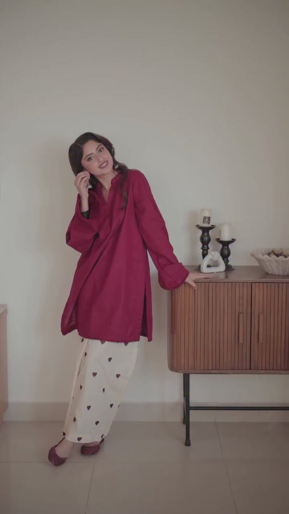 Embrace effortless elegance with the Heart Embroidered co-ord set, meticulously crafted from premium viscose rayon for a silky-smooth feel and a graceful drape. The ensemble features a sophisticated, solid-toned tunic with a contemporary V-neckline, relaxed wide sleeves, and functional side pockets, perfectly paired with high-waisted, wide-leg trousers adorned with a delicate heart-print motif. Whether you choose the earthy brown, classic blue, or vibrant red, this set offers a seamless blend of comfort and style, making it an ideal choice for elevated daily wear or casual afternoon gatherings.