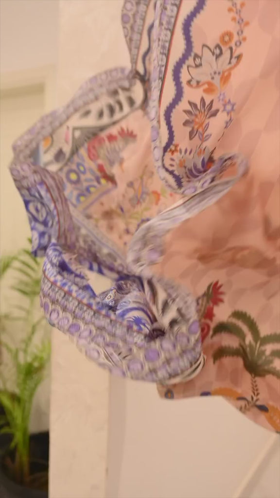 Chic Peach Kurta Set With Dupatta Featuring Intricate Ethnic Prints, Vibrant Hues Of Blue And Purple, And A Flattering V-Neckline. Paired With Coordinated Trousers And A Matching Printed Dupatta, This Ensemble Exudes Effortless Elegance And Contemporary Charm