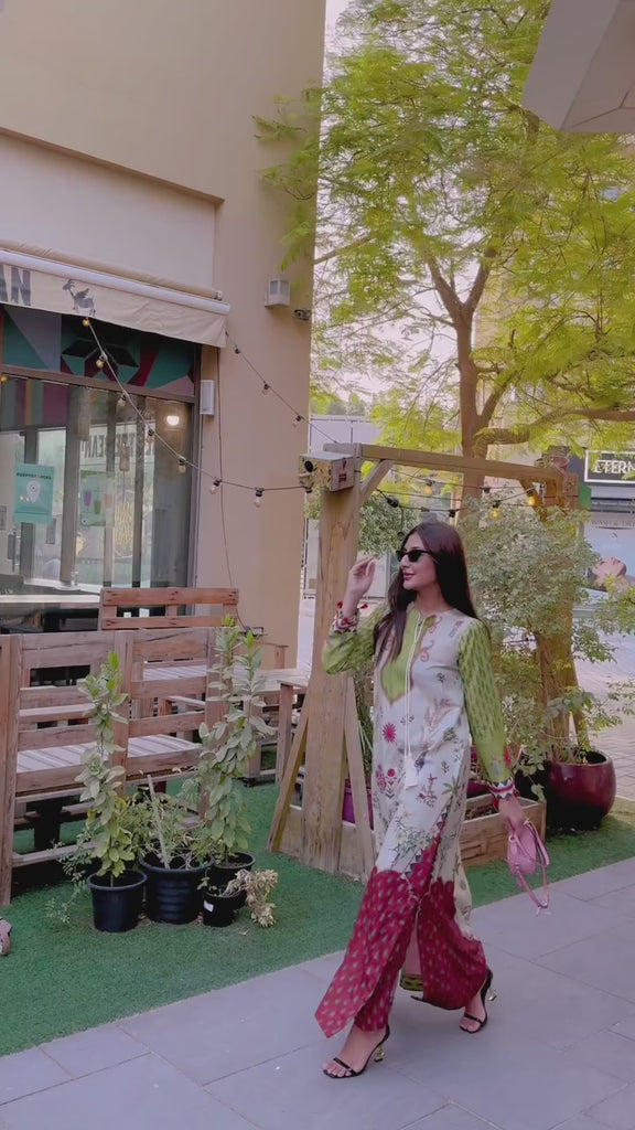 The Chrome White Long Kurta Set is a celebration of vibrant artistry on a serene canvas. Crafted in premium Swiss Cotton, the kurta features a fresh white base highlighted with multicolored botanical motifs and intricate detailing. Contrasting olive-green sleeves and a deep red patterned hemline add depth and character, making this set a standout piece for both casual elegance and festive occasions. Paired with coordinated trousers, it offers effortless style with breathable comfort.