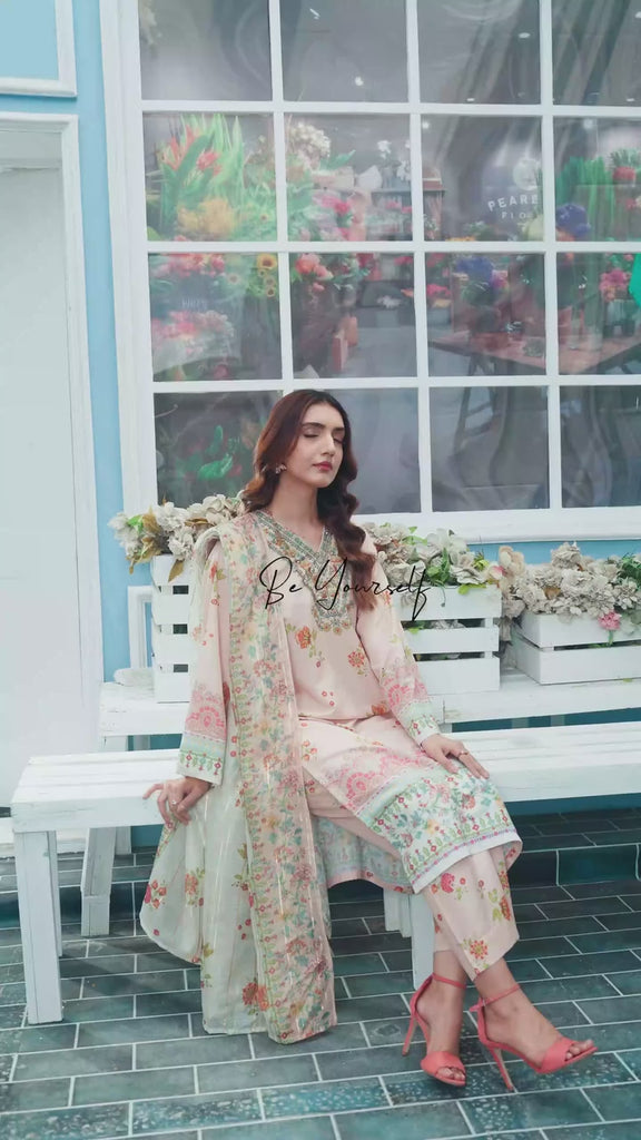 Breathe fresh elegance into your wardrobe with this Spring Kurta Set With Dupatta, crafted from soft and flowy natural crepe fabric. The pastel peach base is adorned with delicate floral motifs, while the neckline features intricate embroidered detailing for a refined finish.