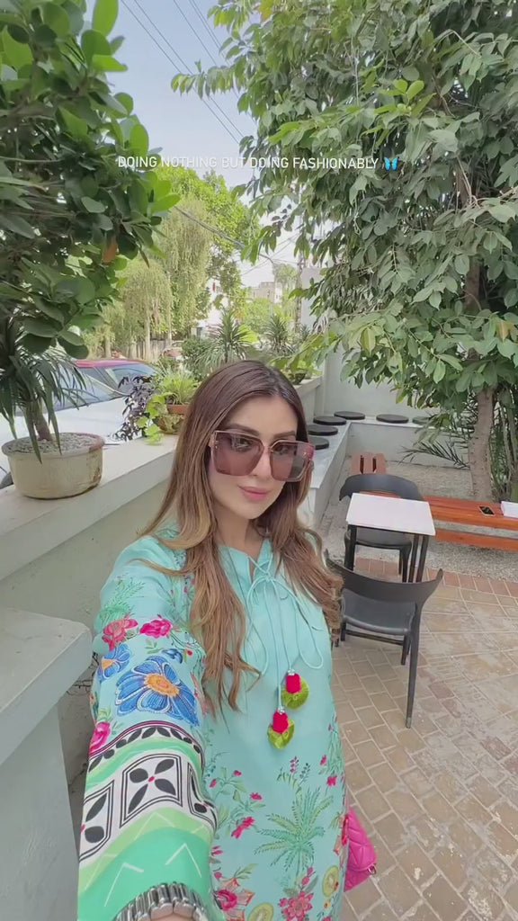 Step into effortless beauty with the Motif Kaftan Dress, crafted from smooth, lightweight Korean BSY fabric known for its soft texture and excellent colour vibrancy. This ankle-length straight-cut dress features a mesmerizing botanical floral print that runs from the neckline to the hem, set against a calming aqua base colour. The intricate design includes bold, colourful blooms in pink, red, and blue, framed by detailed green leaves and delicate vines. Finishing the look are contrasting geometric borders along the cuffs and hemline, adding an element of contemporary structure. The Kaftan Dress is completed with a keyhole neckline, often accented with decorative tassels, making it a perfect blend of traditional elegance and modern, breathable style for daily wear or daytime festivities.