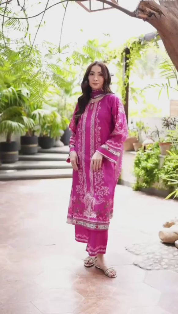 Drench yourself in the vivid charm of the Fuchsia Muslin Suit, a celebration of classic print and striking colour. This exquisite three-piece suit is rendered in a breathtaking Fuchsia/Hot Pink Muslin, offering a soft drape and luxurious feel that's ideal for any occasion.
