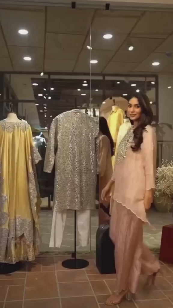 The Rose Quartz Co-ord Set is a luxurious ensemble crafted from Premium Tebby Silk with a comfortable Crepe lining. The standout feature is the tunic's yoke, which is richly detailed with intricate Coded Embroidery and Original Mirror Work. This stunning piece is finished with stylish Semi-Bell Sleeves and delicate Arkha Work along the hem's edges. The outfit is completed with matching wide-leg pants made from Tebby Silk for a seamless, designer look.