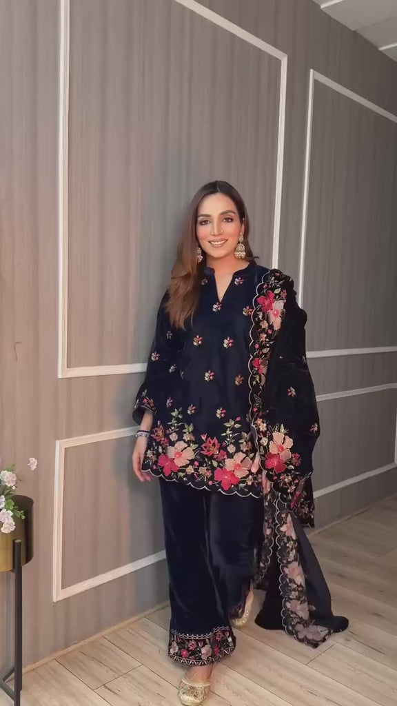 The Velvet Grandeur Co-ord Set is a luxurious 3-Piece ensemble designed for ultimate winter elegance. This heavy set features a fully stitched Velvet Kurta with an inner lining of Micro Crepe for maximum comfort. Both the kurta and the accompanying fully stitched Velvet Palazzo are crafted from premium Heavy Velvet and adorned with exquisite Sequins and Thread Embroidery Work. The outfit is completed by a matching Heavy Velvet Dupatta that boasts the same rich Sequins and Thread Work along its edges, making this a perfect choice for festive or special occasions.
