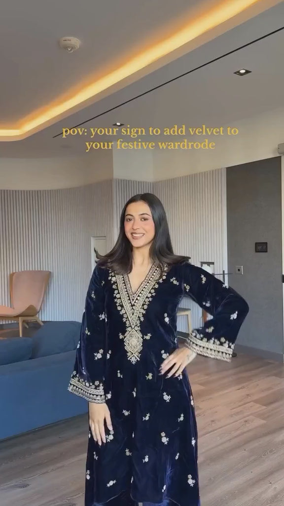 Introducing the Indigo Velvet, a darkly elegant ensemble designed for majestic evenings. This outfit features a rich Viscose Velvet Kurti in a striking deep blue hue, fully lined with soft Micro fabric for comfort. The highlight is the intricate, shimmering thread work accented with high-quality sequins, beautifully defining the V-neckline, sleeves, and hem. The top drapes gracefully to a 38-inch length. It is perfectly paired with matching straight-cut Pants, crafted from the same luxurious Viscose Velvet, offering a comfortable full-stitched elastic waist. The look is completed by a delicate Georgette Dupatta, which adds a sheer contrast and is edged with a sophisticated four-sided fancy lace border, making this outfit an ideal choice for grand celebrations, sangeets, or winter galas.