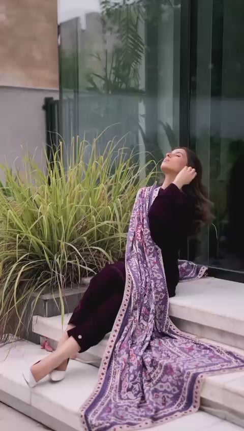 Achieve a look of effortless winter glamour with the Merlot two-piece Co-ord Set, crafted from incredibly soft and plush ice velvet that delivers a luxurious sheen and beautiful warmth. This festive ensemble features a relaxed, mid-length tunic-style top with a chic band collar and a subtle V-neck placket, accented by elegant gold-toned buttons. The tunic is complemented by matching straight-fit trousers, also in deep burgundy ice velvet, creating a perfectly cohesive and comfortable silhouette. The opulent colour and soft texture make this co-ord an ideal choice for holiday parties, formal dinners, or elegant winter events where comfort and statement style are key.