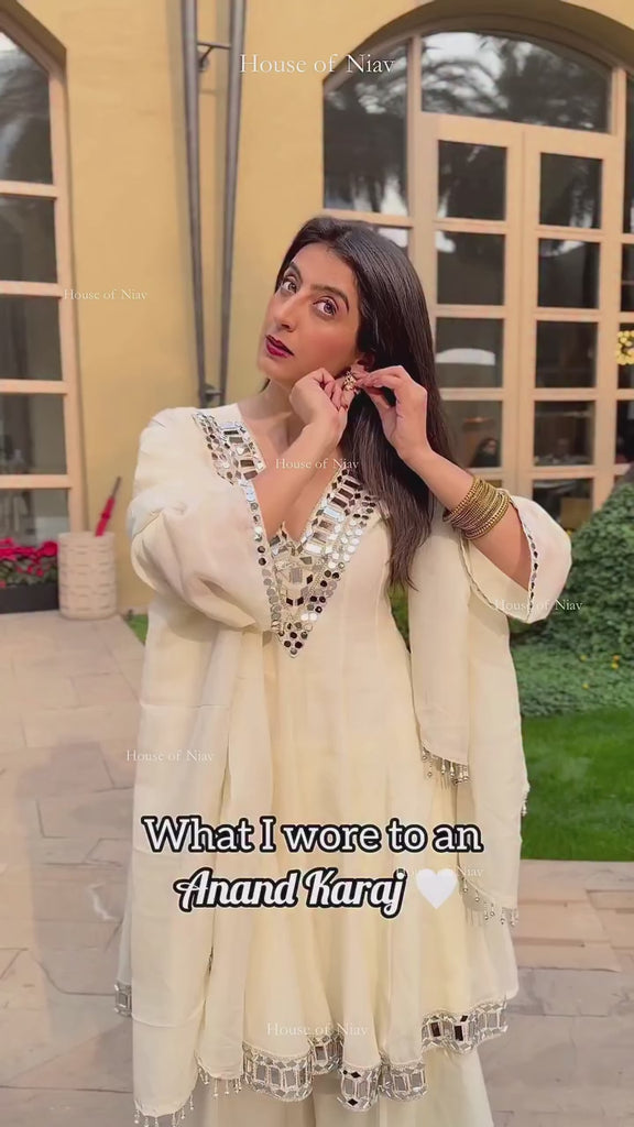 Dazzle in the Glimmer Garara Set, a stunning ensemble that perfectly captures a blend of traditional elegance and contemporary flair. The Kurti is crafted from luxurious Cosmos fabric with a soft Micro inner lining, boasting a vibrant 5-meter flair for a graceful silhouette. It's richly adorned with intricate thread work and real, light-reflecting mirror work along the neckline and hem, truly setting it apart. Paired with a wide-leg Palazzo in matching Cosmos fabric, featuring a comfortable full-stitched elastic waist (fits up to 44 inches). The look is completed by a lightweight Cosmos Dupatta finished with an elegant four-sided fancy lace border, making this outfit ideal for any festive occasion or celebration.