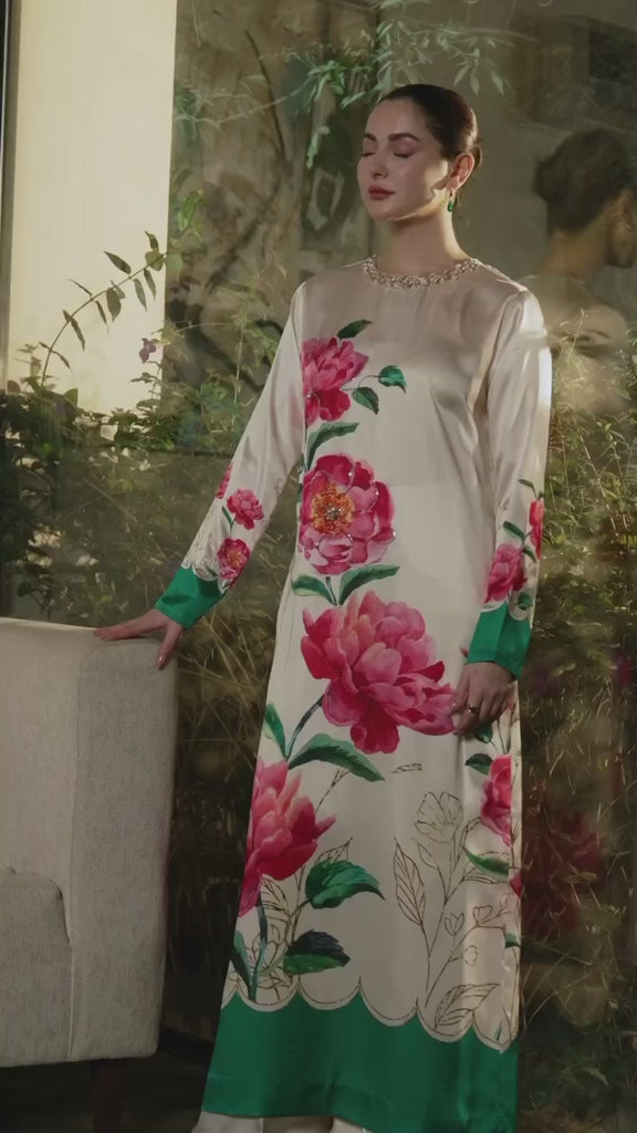 This exquisite kurta set blends luminous ivory and vibrant blush pink in a sophisticated floral silhouette, adorned with oversized peony prints that feel both artistic and timeless. Designed with a relaxed, straight-cut kurta featuring an elegant pearl-beaded neckline and statement teal-accented sleeves, it pairs seamlessly with matching trousers for a polished yet effortless look. Crafted from premium Muslin, this set strikes the perfect balance between breathable comfort and high-fashion sophistication, ideal for intimate gatherings, festive brunches, or elevated celebrations.